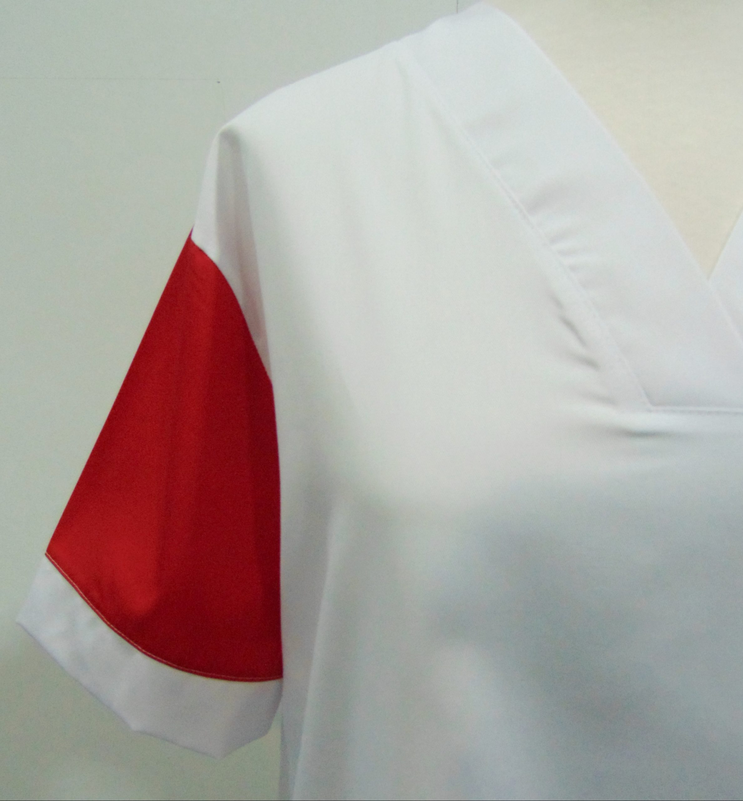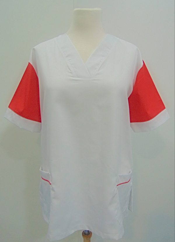 Casaca sanitaria unisex, con cuello en pico y manga corta. 2 bolsillos laterales. Resistente y muy comoda.