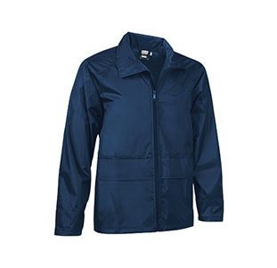 Chaqueta ligera de corte amplio, fabricada en tejido a la plana hidrofugado con recubrimiento de PVC. Cuello alto y cierre delantero con cremallera entera. Capucha con cordón de ajuste recogida en un bolsillo con cremallera en el cuello y abertura en espalda para facilitar la ventilación. Puños dobles con elástico en el interior. Incluye dos bolsillos delanteros con tapeta.